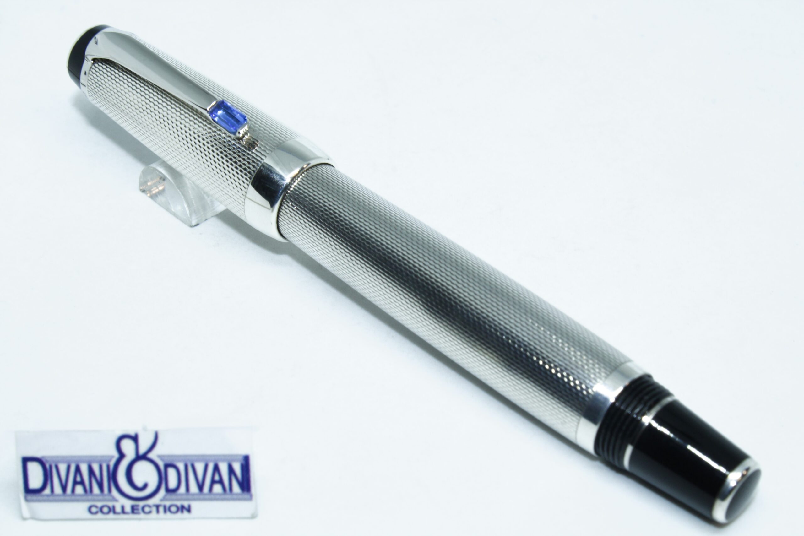 + EnvíoPluma fuente elaborada en plata 925, tres anillos de plata esterlina 925 con marca Montblanc incrustado, clip platinado engastado con una piedra sintética color azul, con número de serie individual, sistema de carga mediante cartuchos o émbolo, punto en oro blanco 14k.